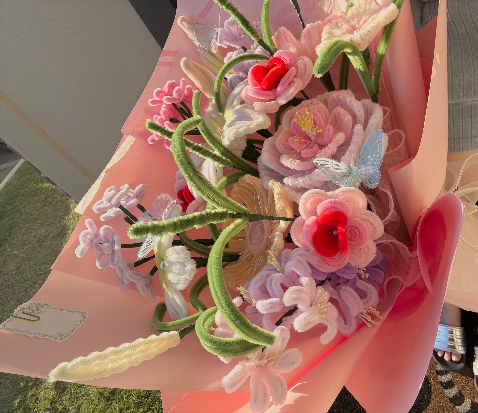 A luxurious arrangement filled with layered handmade blooms — roses, lilies, peonies, and delicate accent flowers — all crafted from soft fuzzy wire in dreamy pastel tones. Curved stems, tiny details, and a shimmering butterfly bring movement and charm, while the peach-pink wrapping and pearl-trimmed bow complete the premium look.