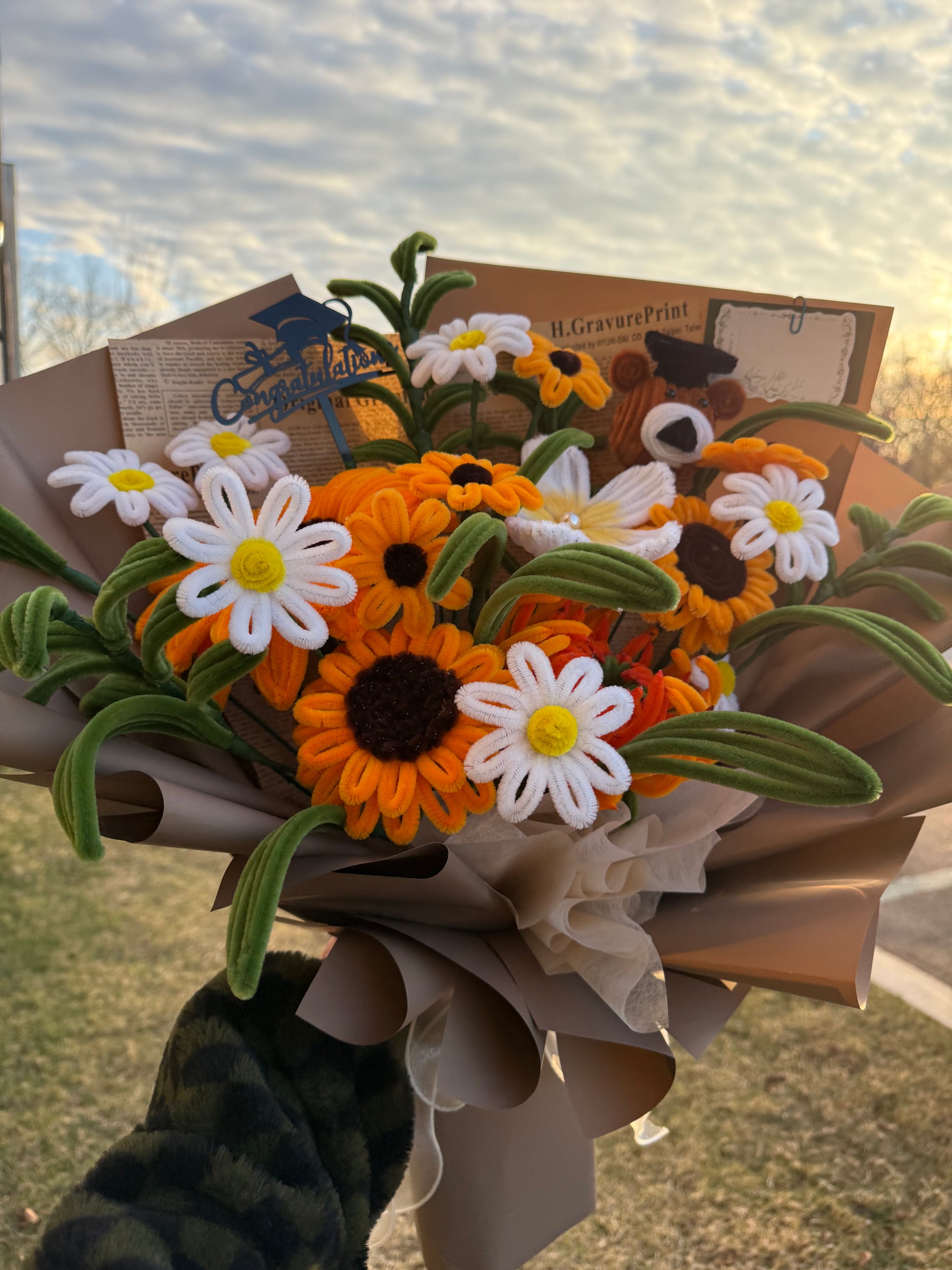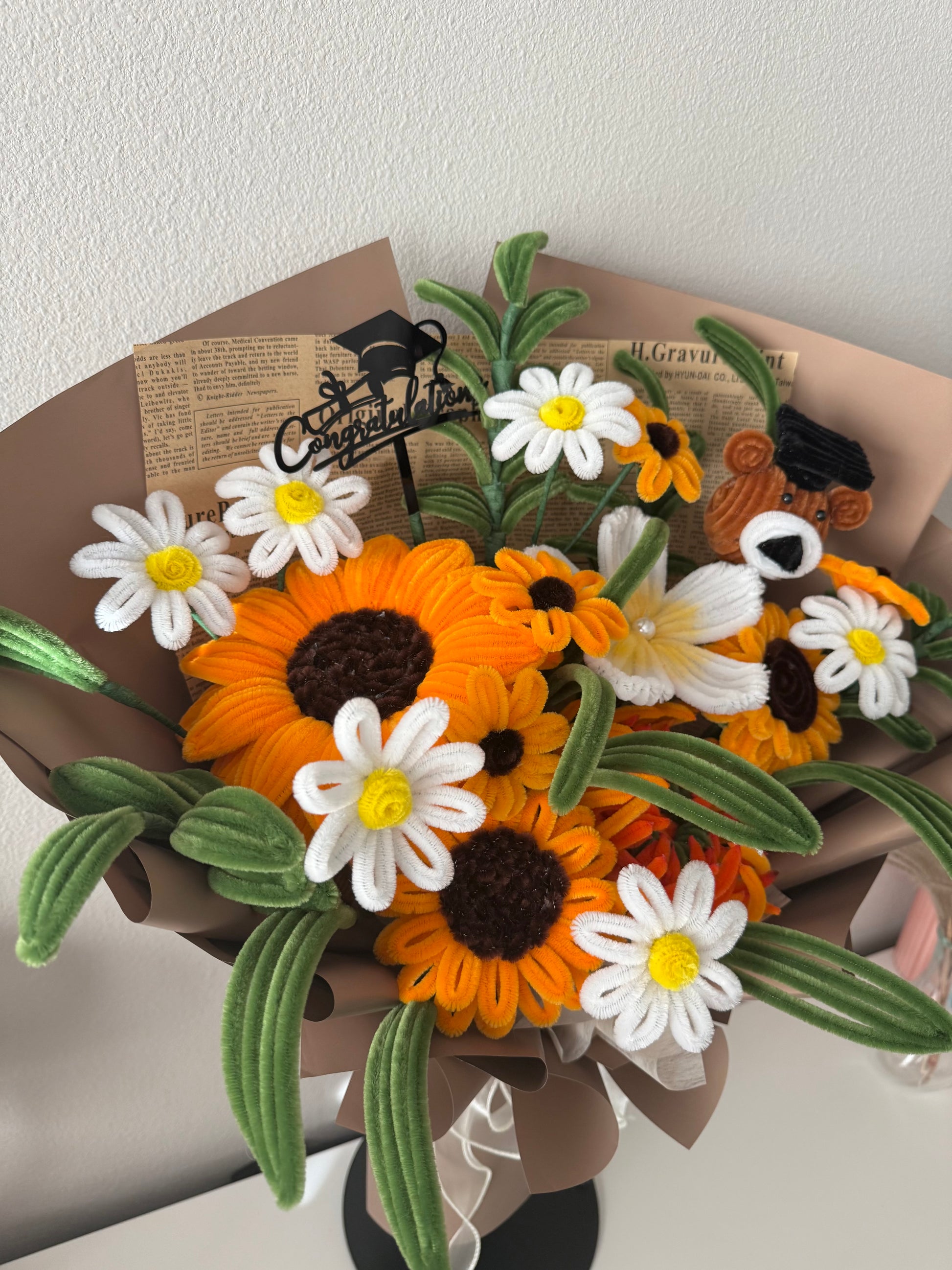 A bright and cheerful bouquet filled with handmade sunflowers, daisies, and warm orange blooms — all crafted from soft fuzzy wire. Finished with lush green stems, layered wrapping, and a cute little graduate bear, this bouquet brings sunshine and celebration to any graduation day.