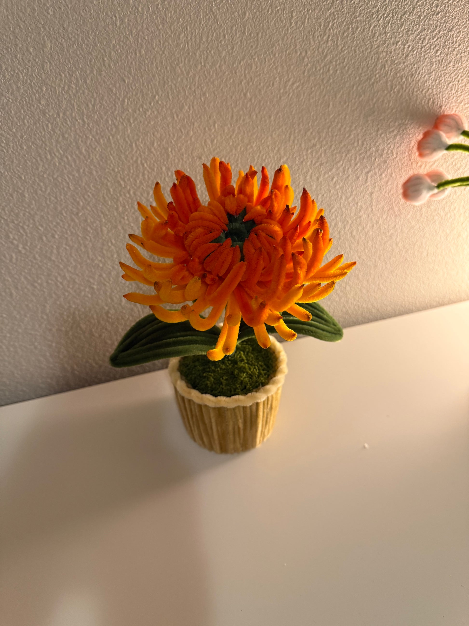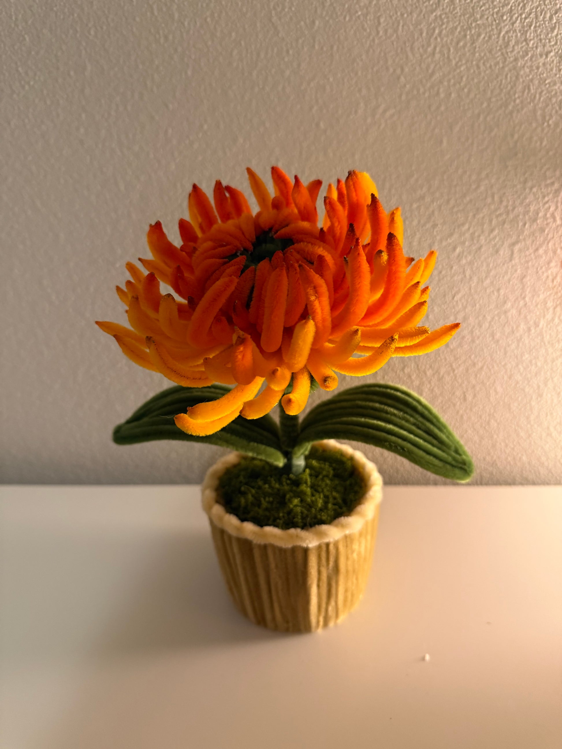 A bright and bold chrysanthemum bloom crafted from soft fuzzy wire, featuring layered orange petals and rich green leaves. Set in a tiny pot with moss detail and a warm golden tone, this piece adds a cheerful, autumn-inspired pop of color to any desk or shelf.