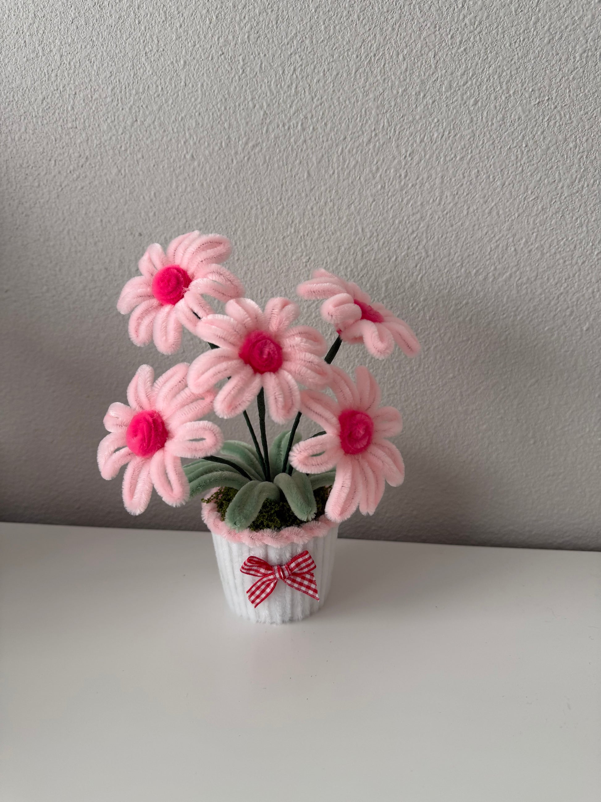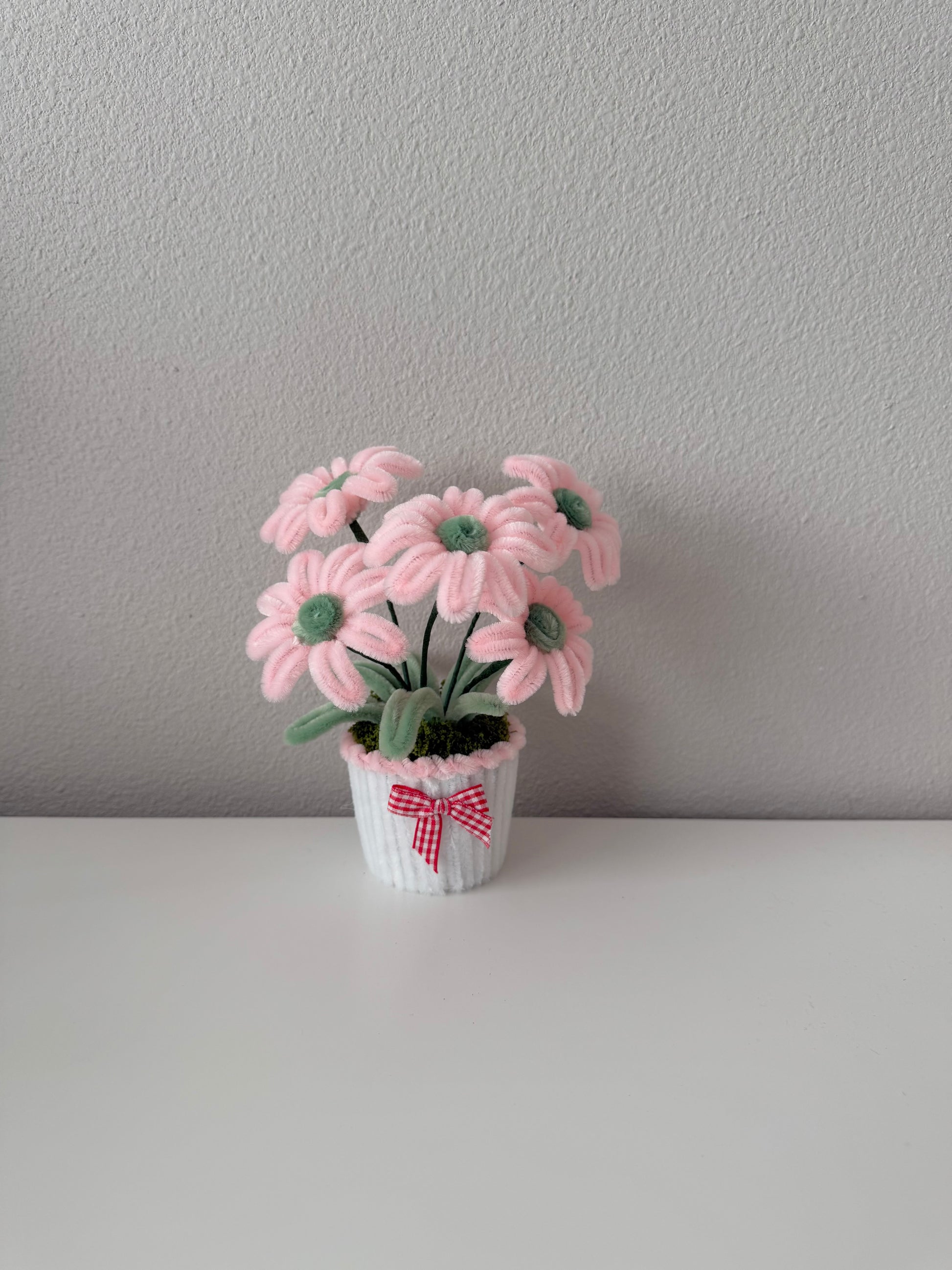 A cheerful cluster of soft pink daisies crafted from fuzzy wire, arranged in a tiny pot with moss greenery and a cute gingham bow. These pastel blooms add a gentle, happy touch to any desk, shelf, or gift. Lightweight, long-lasting, and completely handmade with care.
