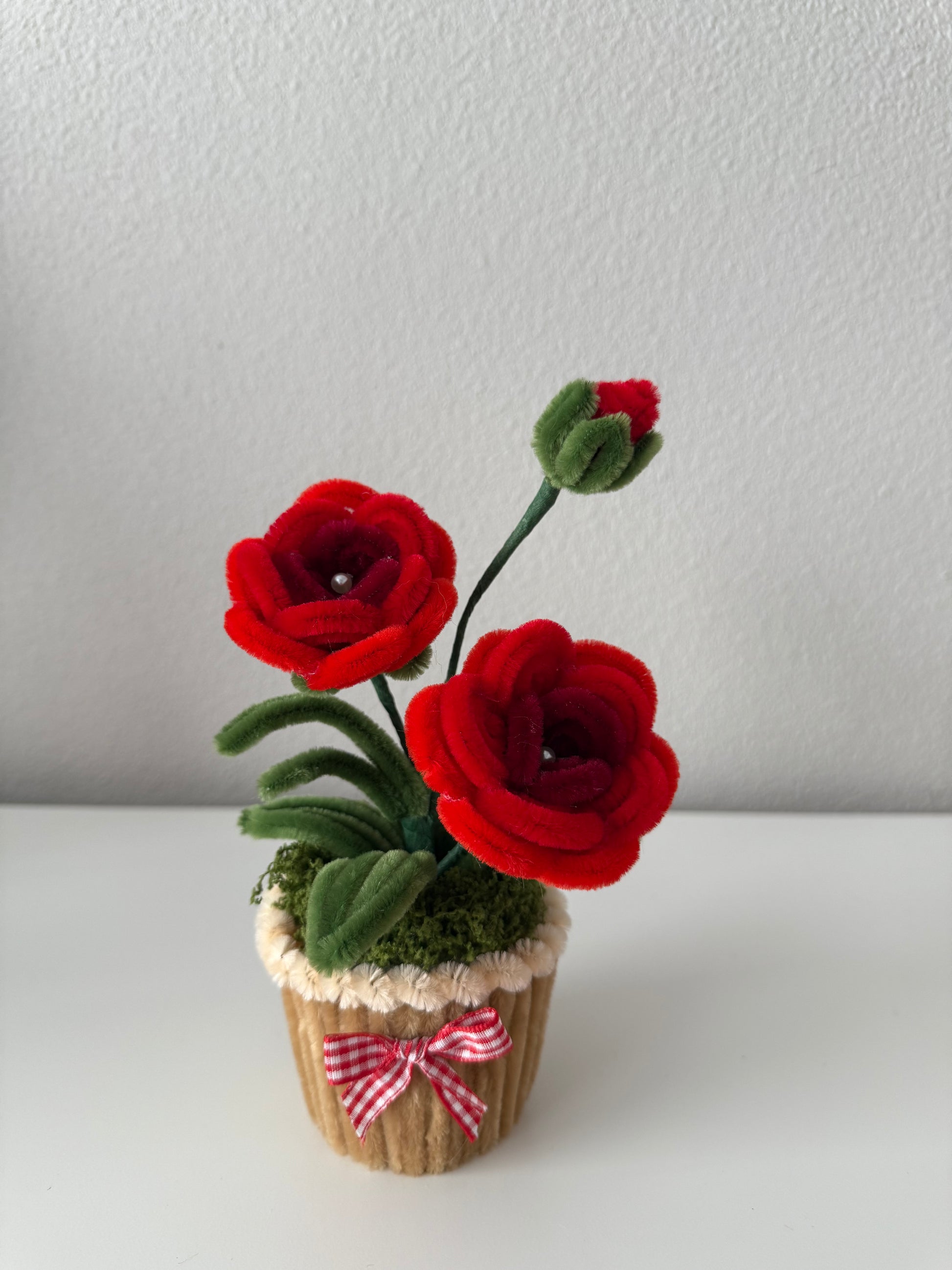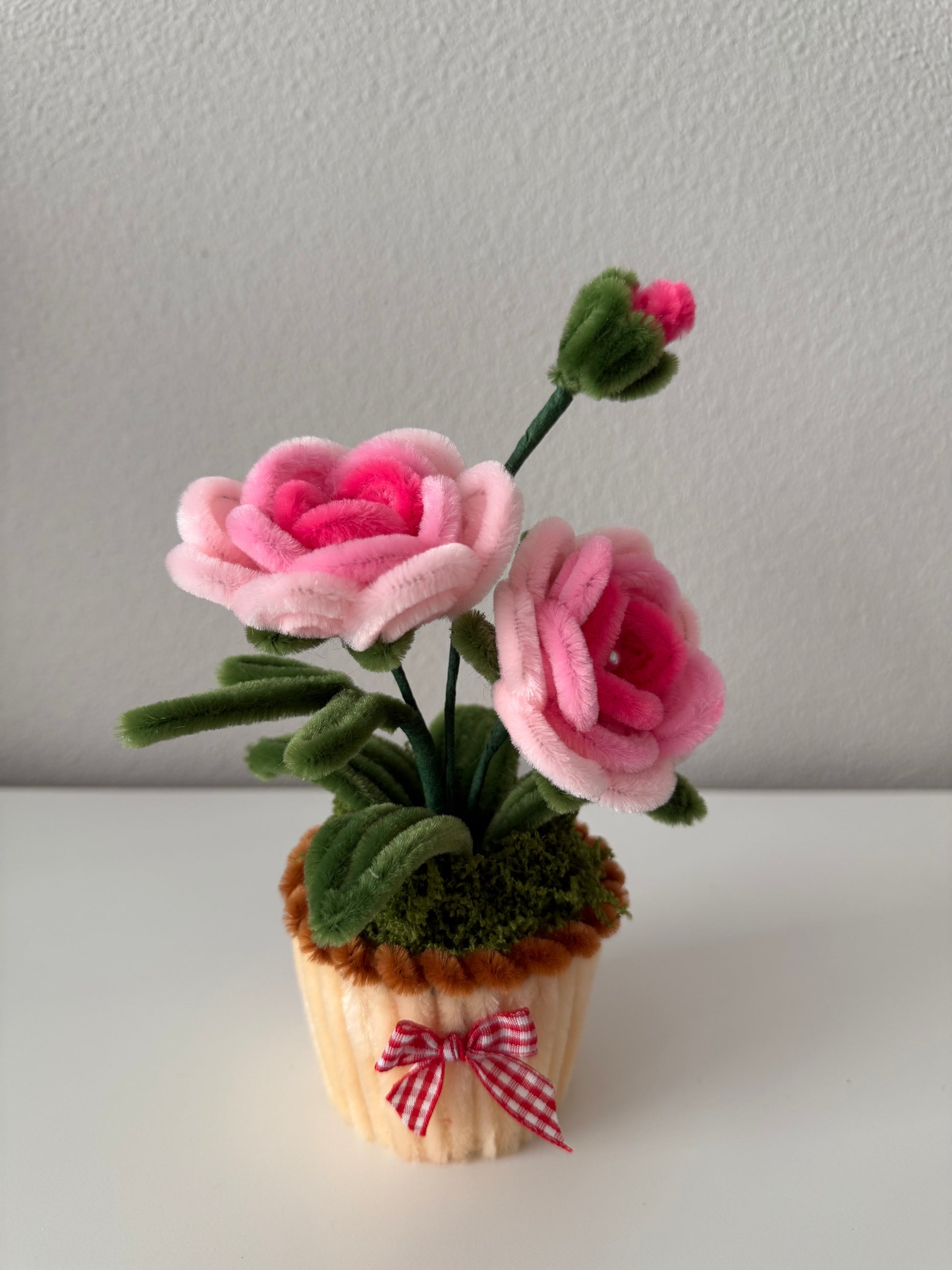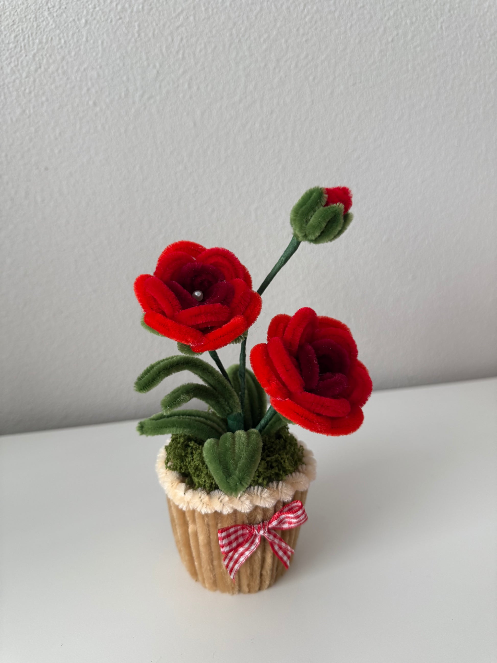 Adorable mini rose arrangements crafted from soft fuzzy wire, available in blue, pink, and red. Each pot is decorated with moss greenery and a tiny gingham bow for extra charm.