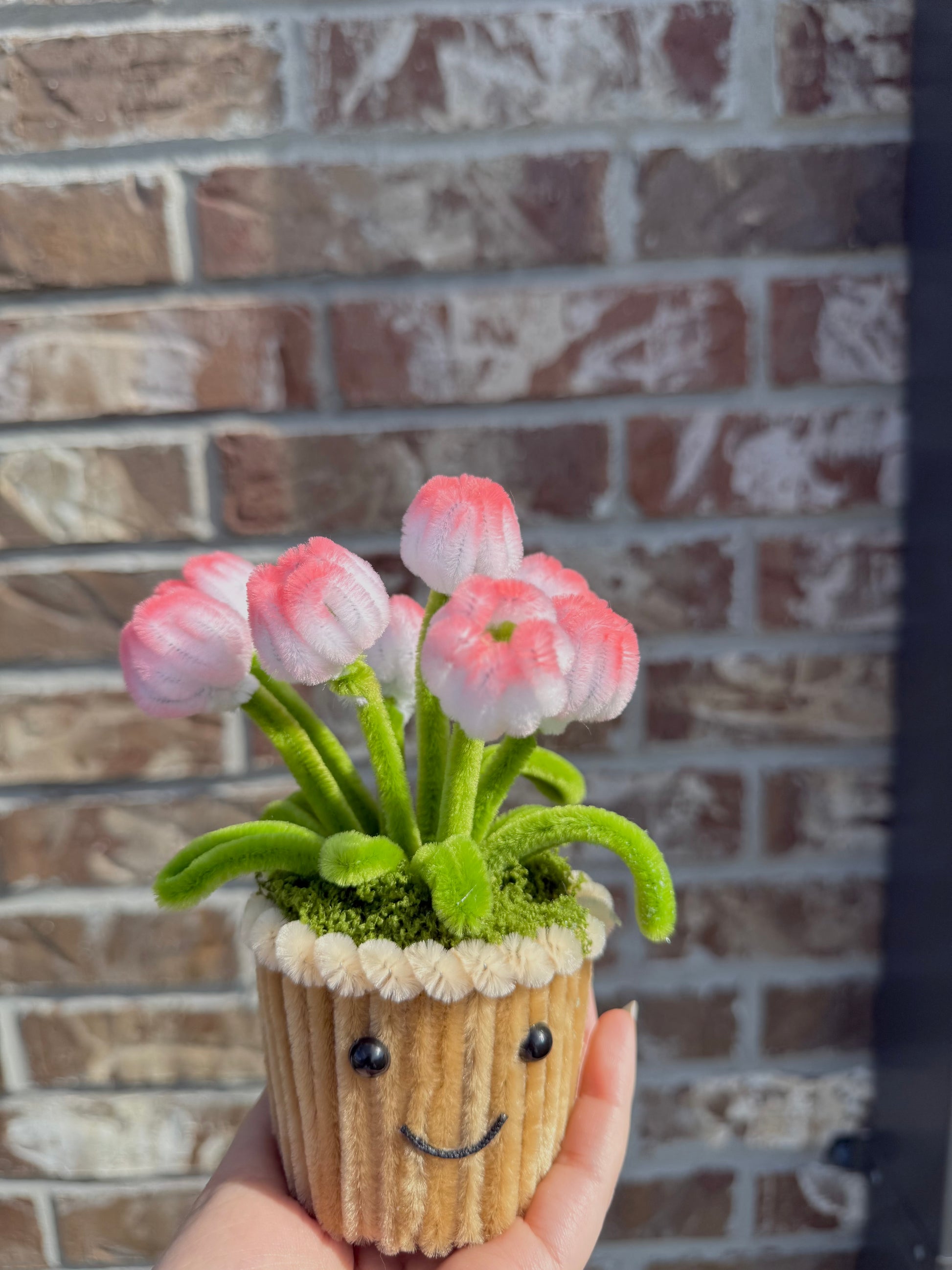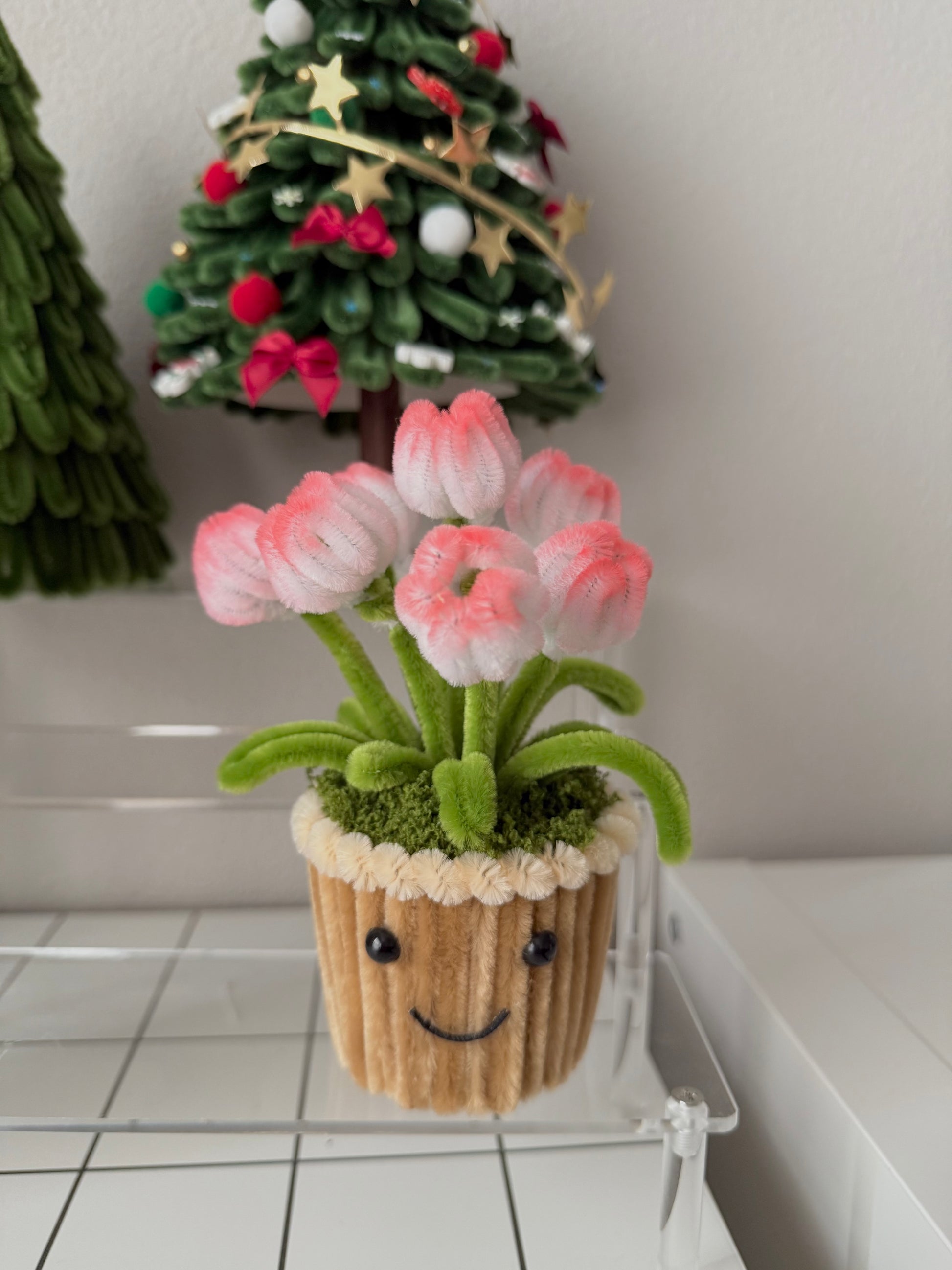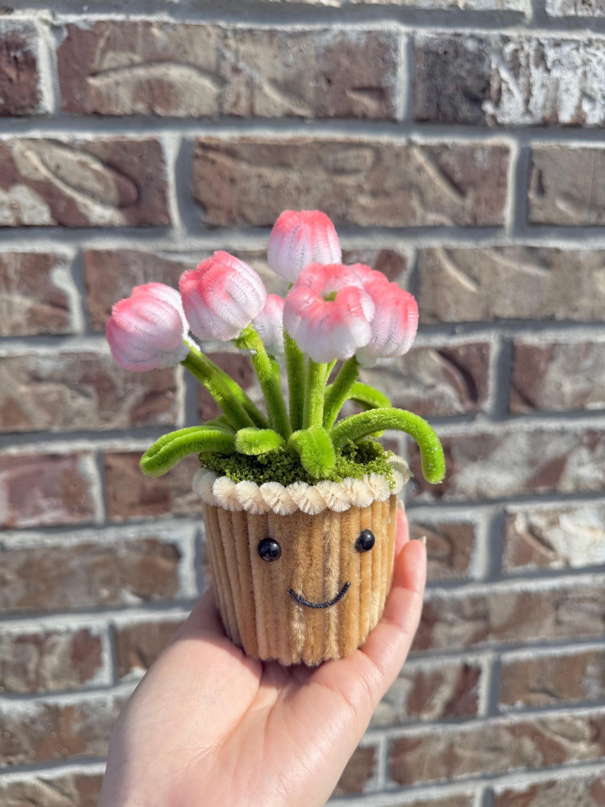 The Tulip Mini Pot features soft pink fuzzy-wire tulips blooming from a tiny smiling pot, complete with plush green leaves and moss details. This little cutie instantly brightens any desk, shelf, or gift — a perfect mix of charm, color, and personality.