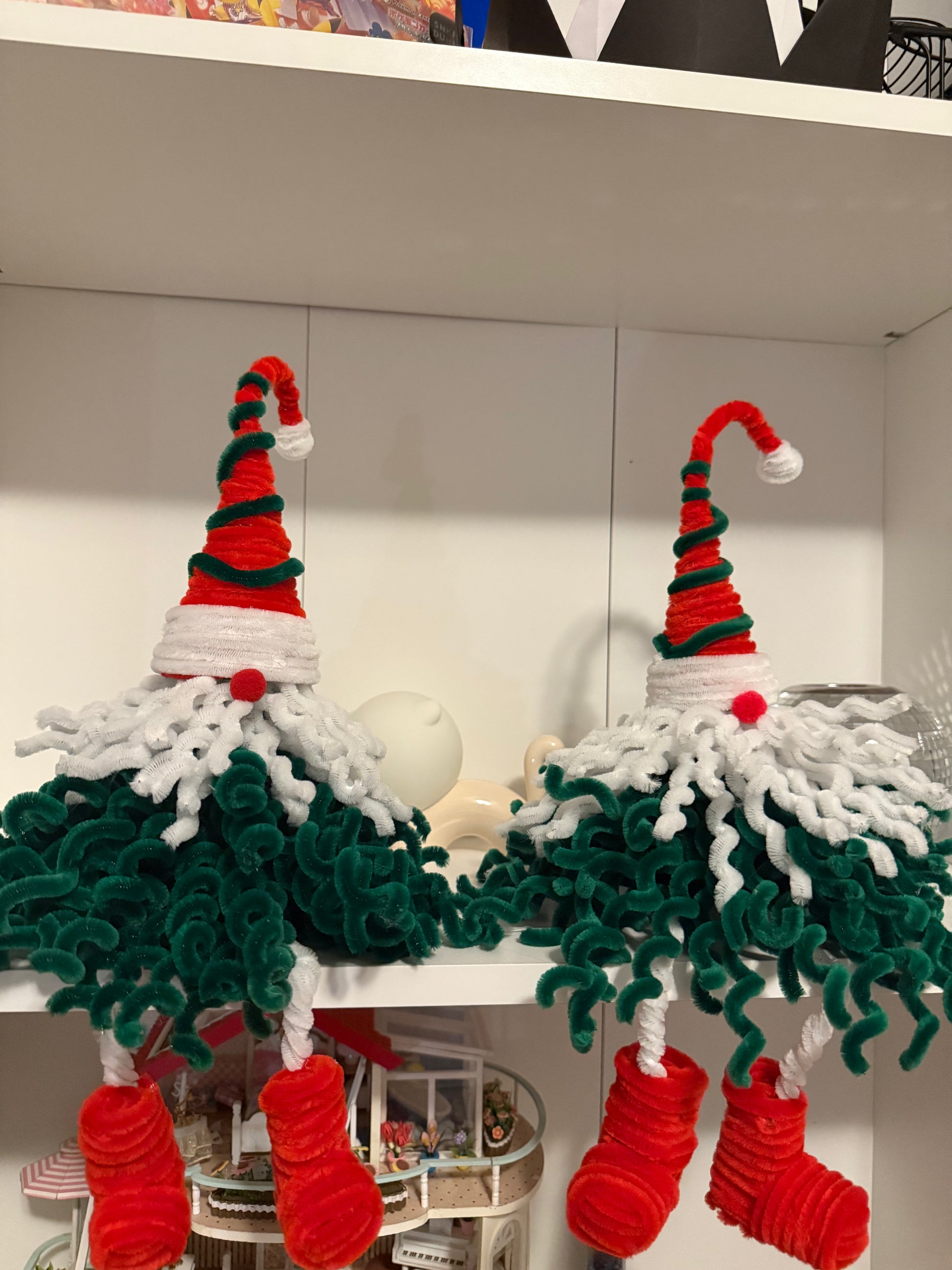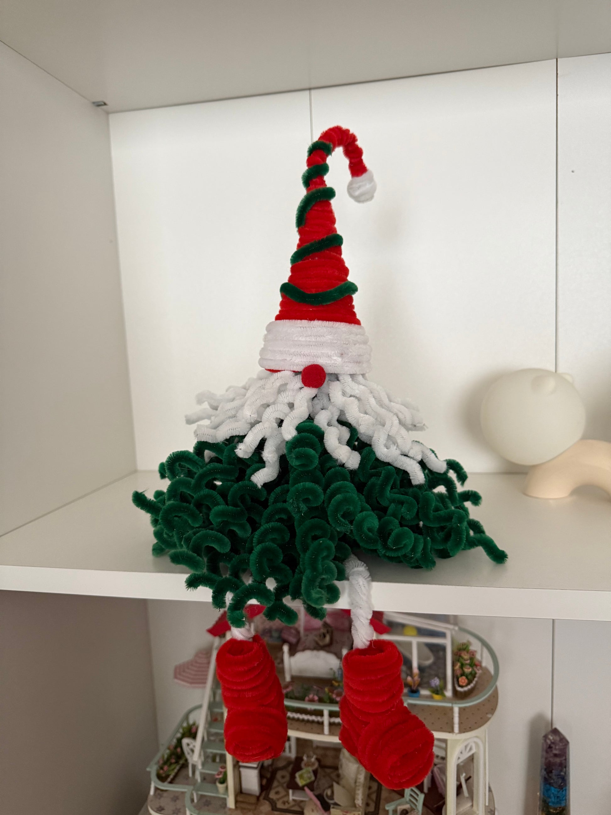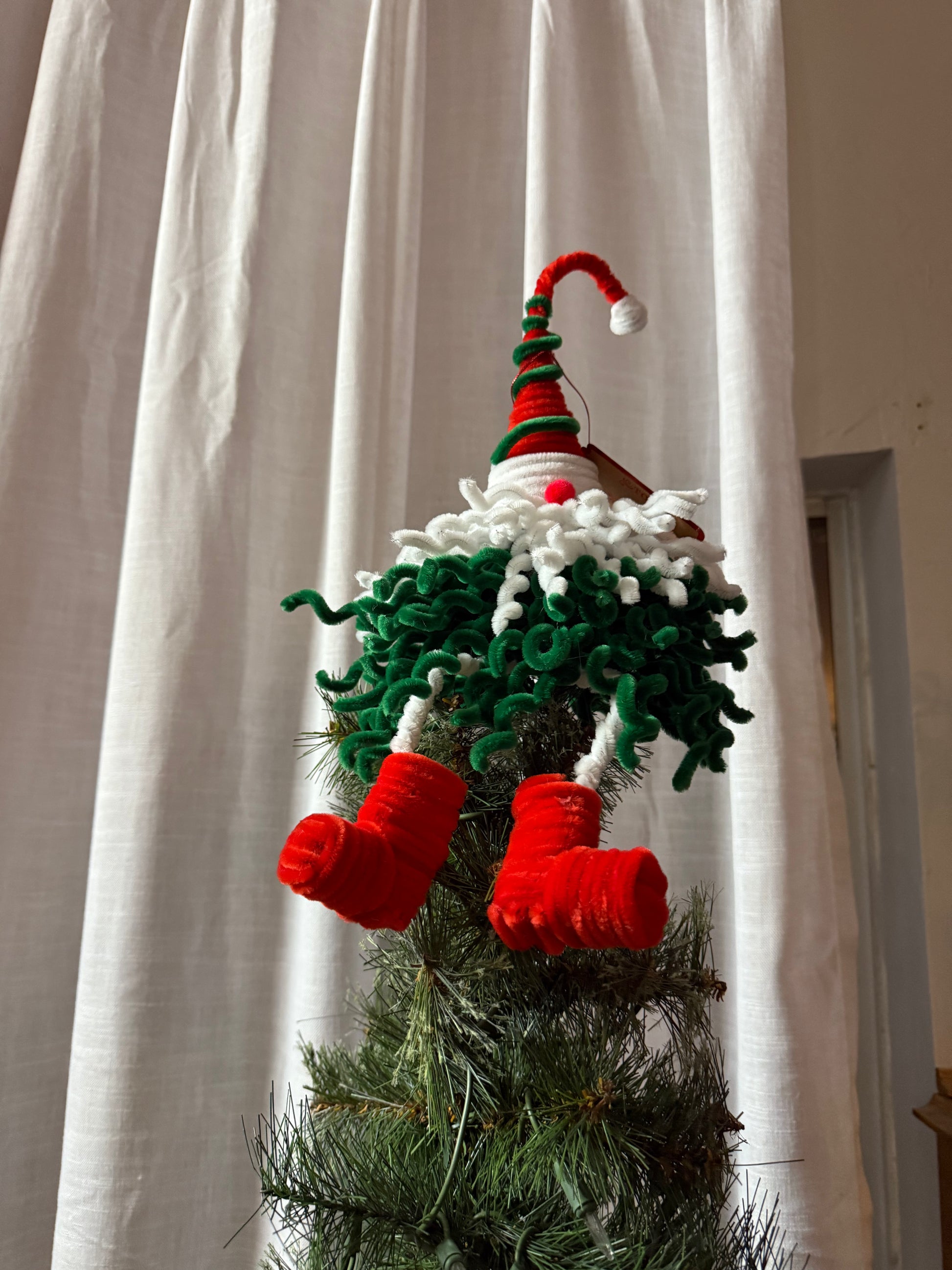 This festive gnome sits proudly at the top of the tree with his curly green beard, fluffy white trim, bright red boots, and a tall candy-cane hat. Crafted entirely from soft fuzzy wire, he adds personality, charm, and a touch of whimsy to any Christmas tree.